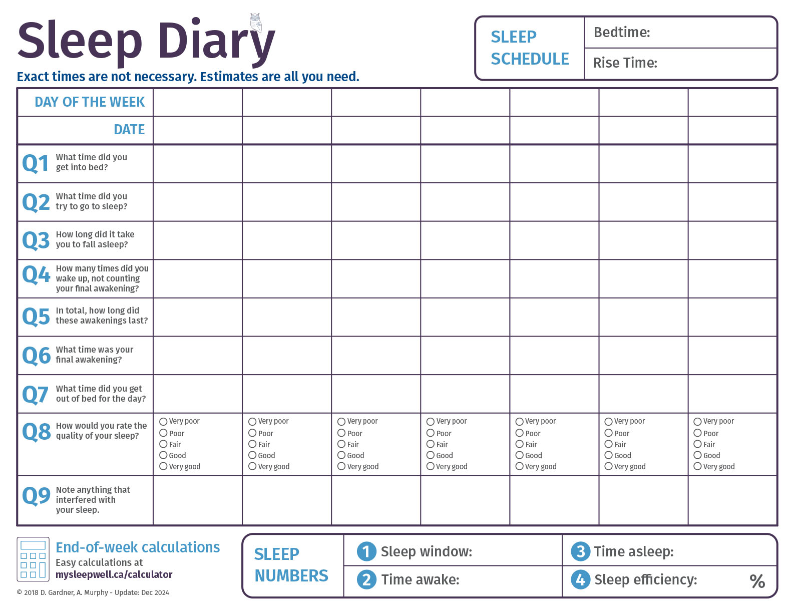 A sleep diary is an important tool for the treatment of insomnia. Use it to help regulate your sleep schedule and see patterns and changes in your sleep.
